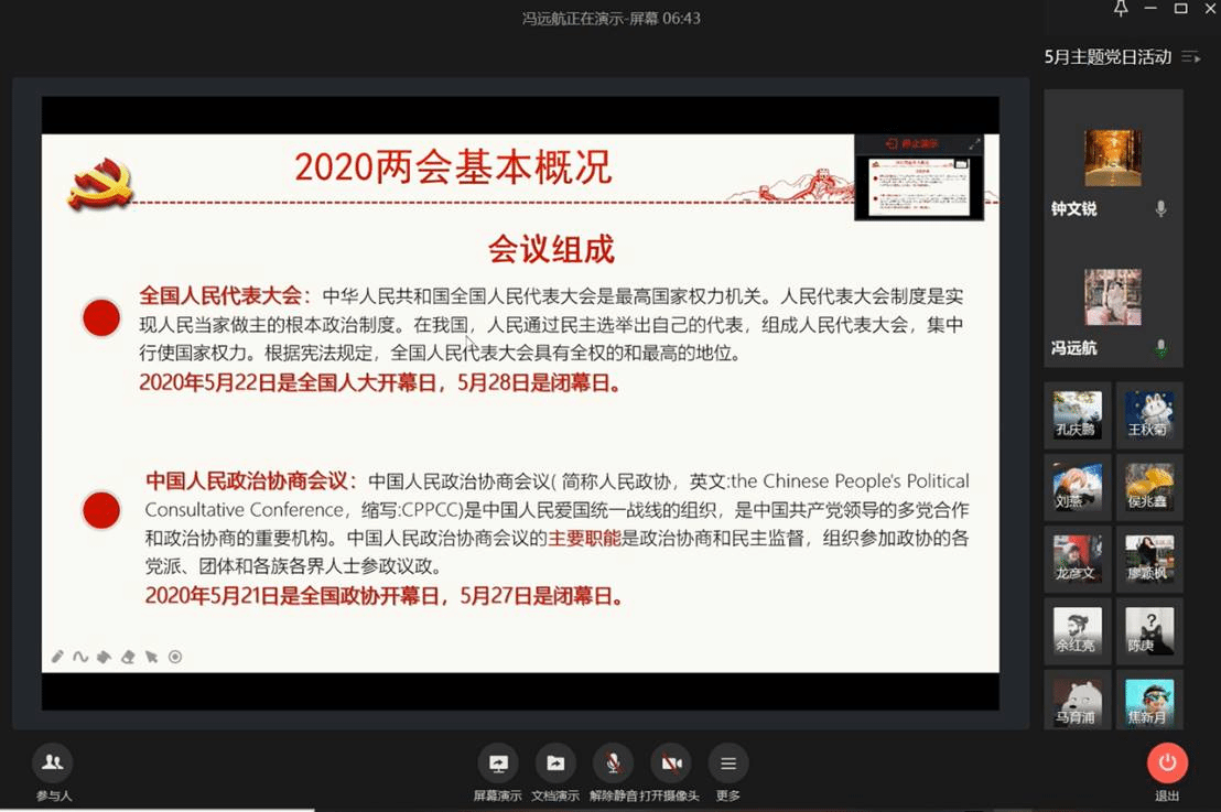 2020年5月29日下午3点,我院本科生党支部和行政党支部通过企业微信联合开展5月线上主题党日活动,本次主题党日活动共有2个环节:学习讨论2020年“两会”精神和我为人工智能教育学部建设献一策。活动由院党委副书记、行政党支部书记钟文锐主持,院党委书记游丽以普通党员身份参加学习,行政党支部、本科生党支部全体党员参加。